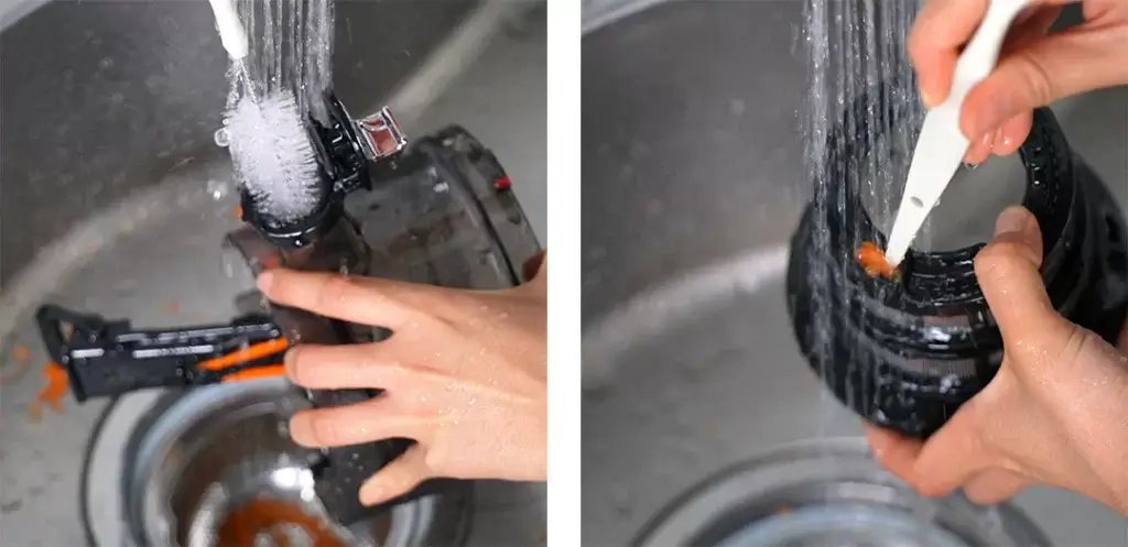 Meyve suyu haznesi kabının temizlenmesi de çok zor değildir. Meyve suyu haznesinin posa çıkışında sıkışmış olabilecek posayı çıkarmak için temizleme fırçasının arka kısmını kullanabilirsiniz. Akan suyun yardımıyla posa kolayca düşecektir.