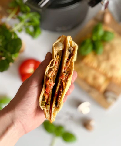 Domates sosunu üç parçaya koyun ve vegan peyniri, mantar ve kabak ile kaplayın.