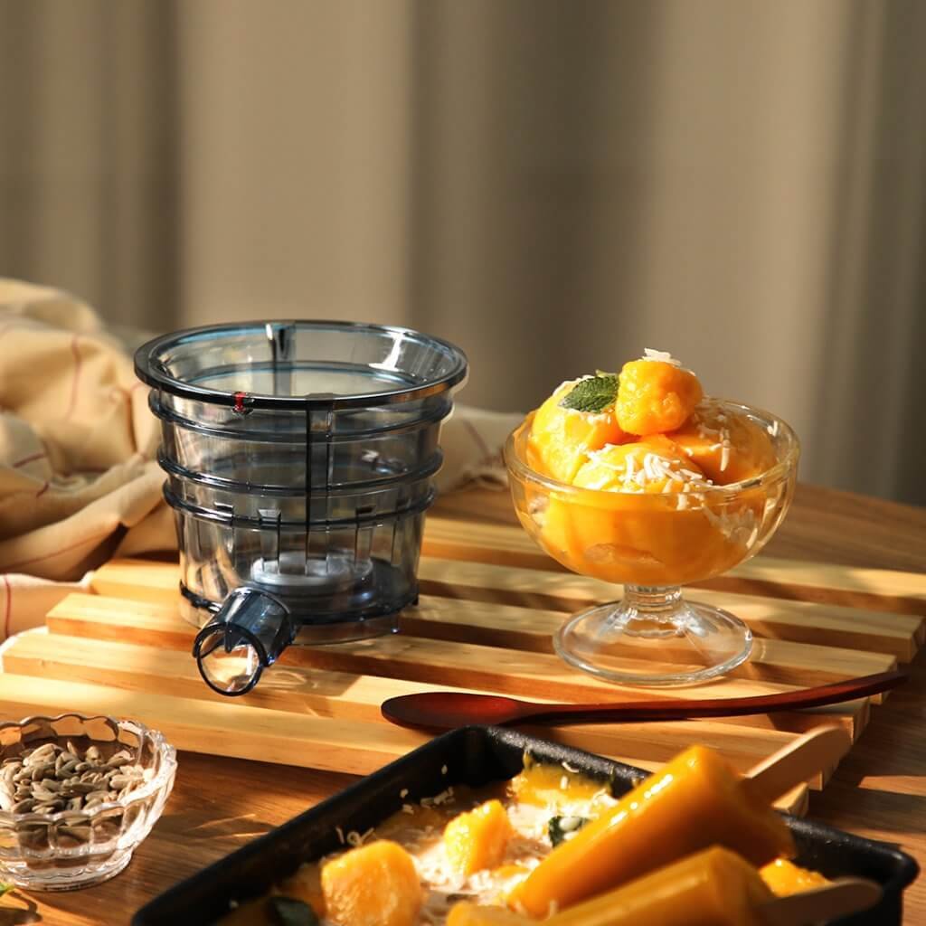Dondurma aparatını meyve sıkacağınıza takın, istediğiniz dondurulmuş meyveleri ekleyin ve Kuvings’inizin bunları zahmetsizce pürüzsüz, kremsi sorbelere dönüştürmesini izleyin.