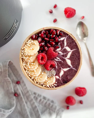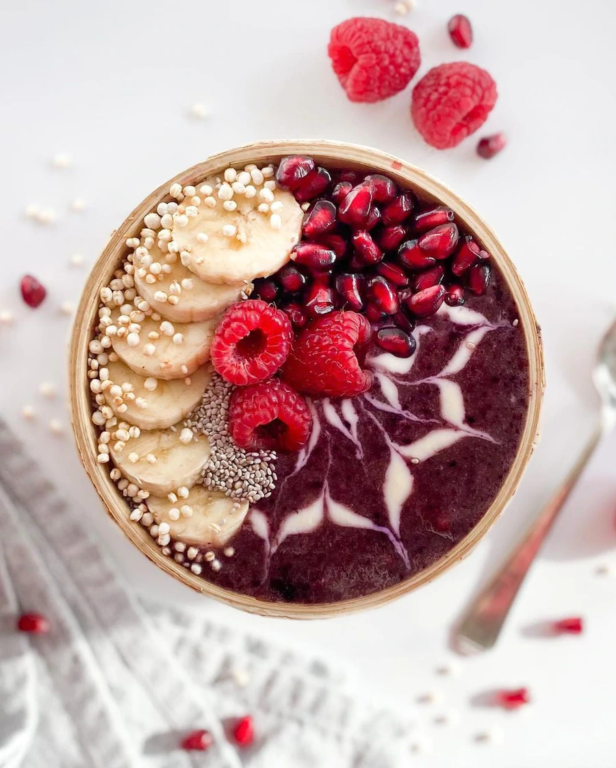 Muz, ahududu, nar, chia tohumları, fındık, yulaf, kabarık kinoa